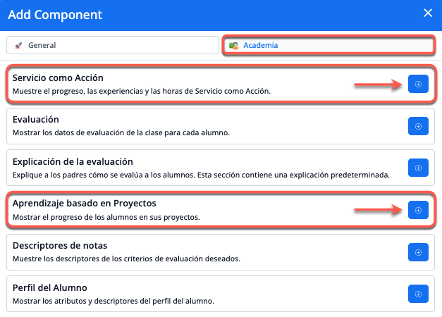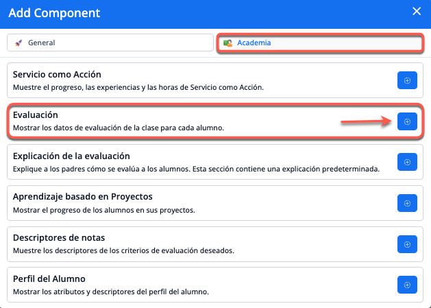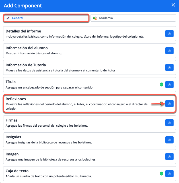 Para mostrar las calificaciones y los comentarios en los informes de notas, ve a la plantilla del informe > Agregar componente > Academia.