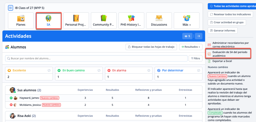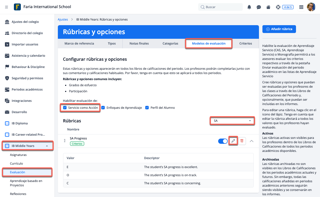 Puedes editar los valores y descriptores de cualquier rúbrica a través de Ajustes > IB Middle Years > Evaluación > Modelos de evaluación. Habilita las rúbricas de evaluación para SA marcando la casilla de Servicio como Acción.