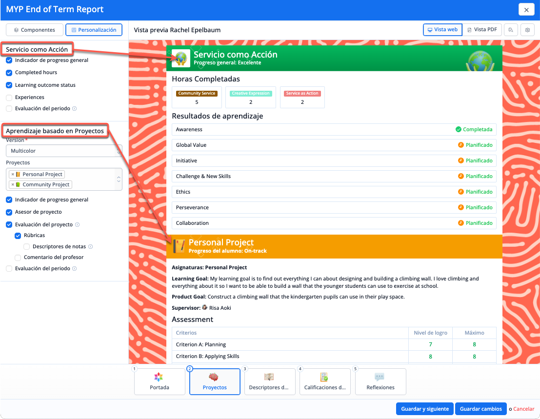 Añade componentes de Servicio como Acción y Aprendizaje basado en Proyectos a cualquier plantilla de informe de los Años Intermedios del IB y personalízalos para que incluyan información relacionada con el SA.