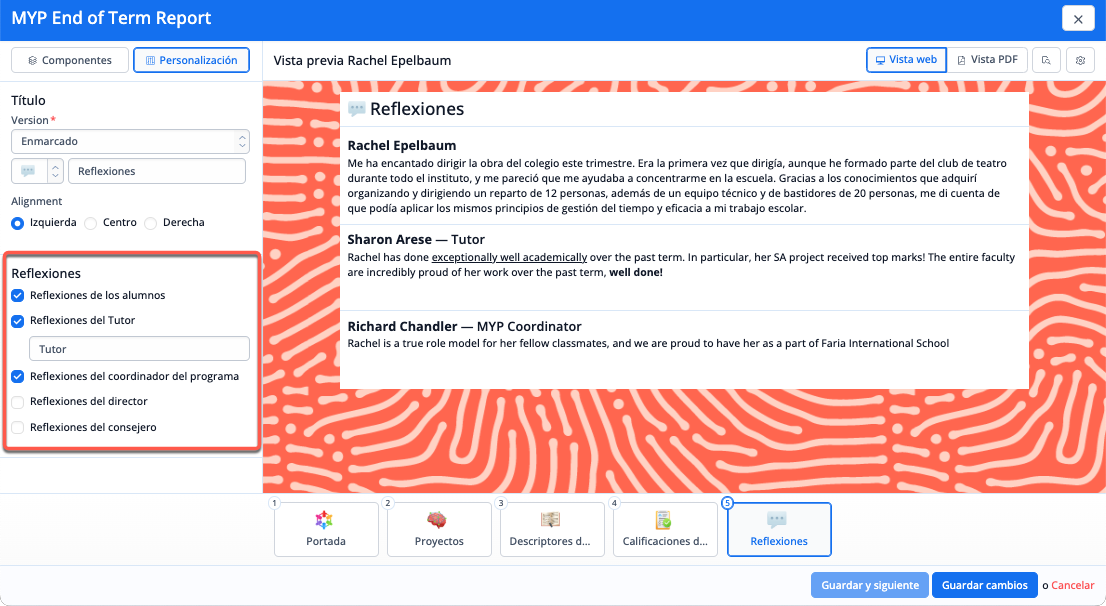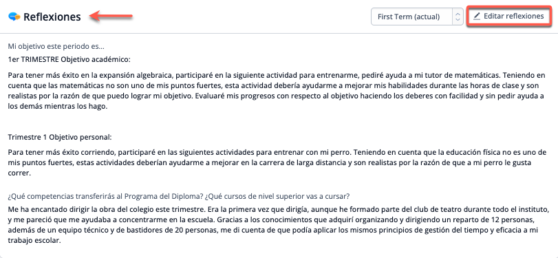 Pulsa la pestaña Reflexiones para leer y editar las reflexiones del Alumno, Asesor, Coordinador, Director del colegio o Consejero. Estas reflexiones se pueden activar en el informe de calificaciones a través de la plantilla de informe (véase más abajo).