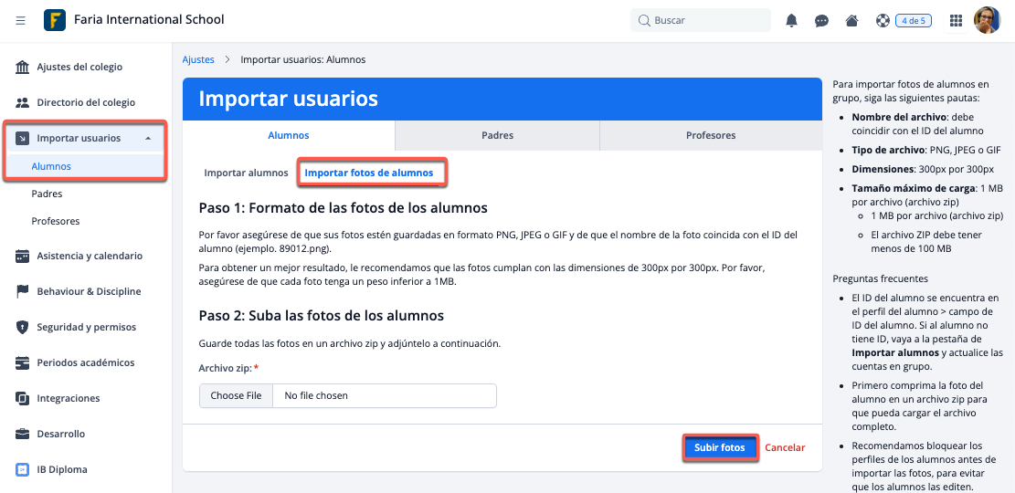 Para mostrar las fotos de los alumnos en sus informes de calificaciones, primero debes cargar masivamente las fotos de perfil de los estudiantes en el sistema. Para empezar, pulsa en Ajustes > Importar usuarios > Alumnos > Importar fotos de alumnos. Carga un archivo zip con las fotos de tus alumnos en el que el nombre de cada foto coincida con el ID del alumno.