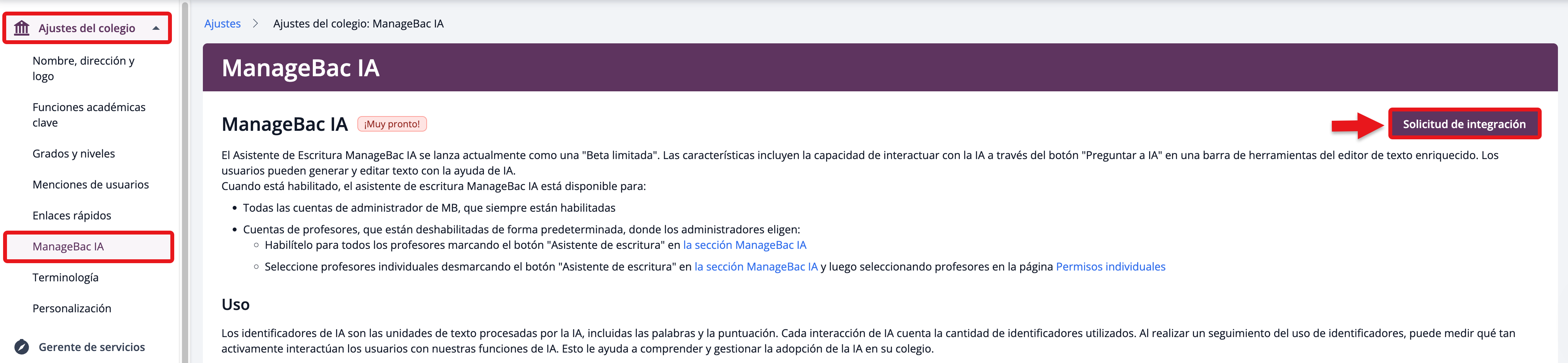 Para empezar, cualquier administrador de ManageBac+ puede habilitar la función del Asistente de Redacción para su colegio navegando a: Ajustes > Ajustes del colegio > ManageBac+ IA > Solicitud de integración.