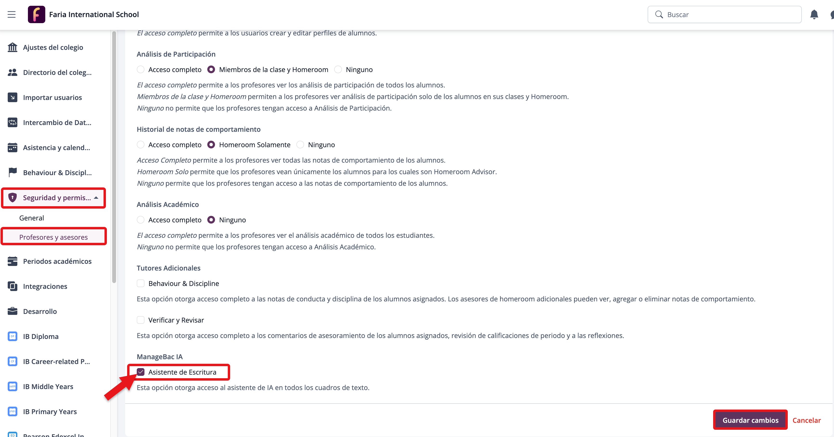 Ajustes > Seguridad y permisos > Profesores y asesores > ManageBac+ AI > marcar “Asistente de Escritura”.