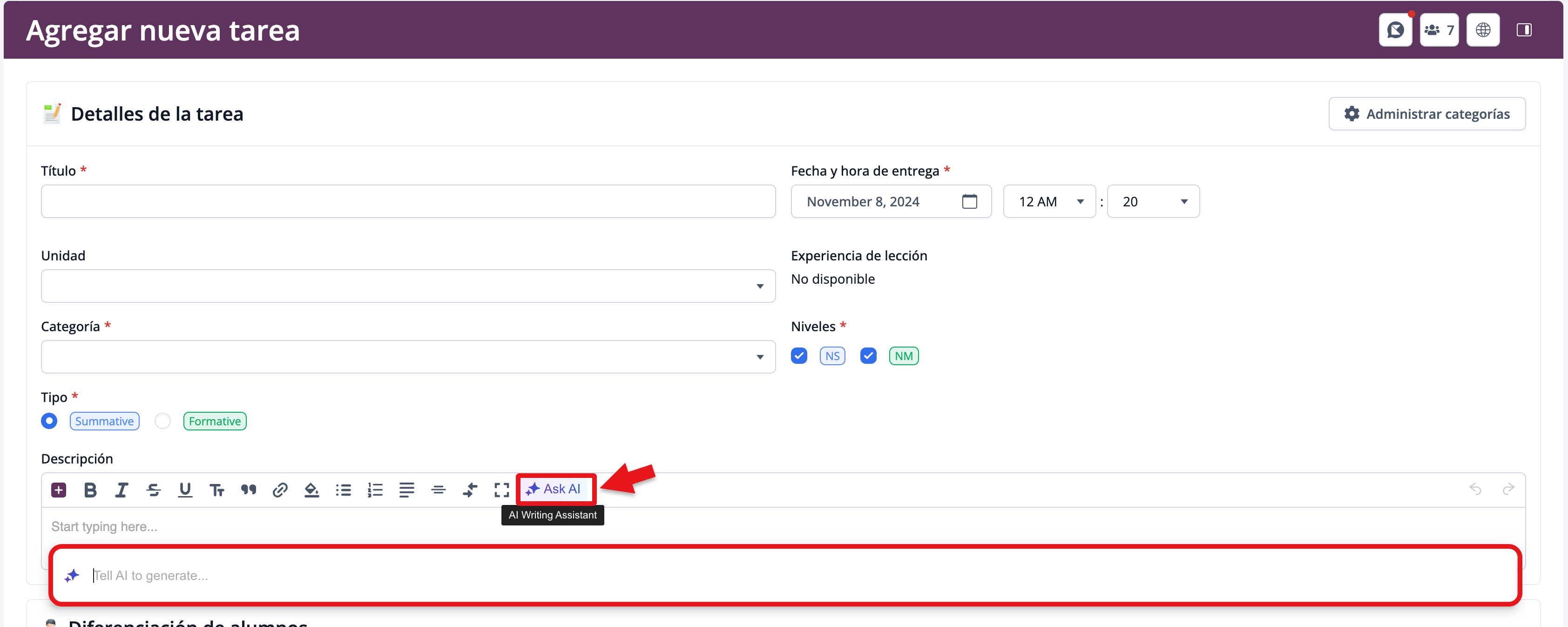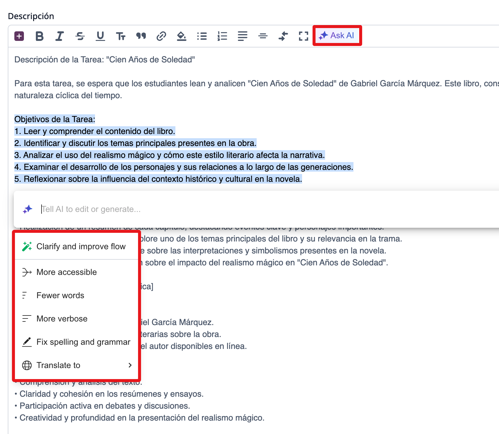 Los profesores también pueden usar Ask AI para modificar contenido existente dentro del Editor de Texto Enriquecido (Rich Text Editor).