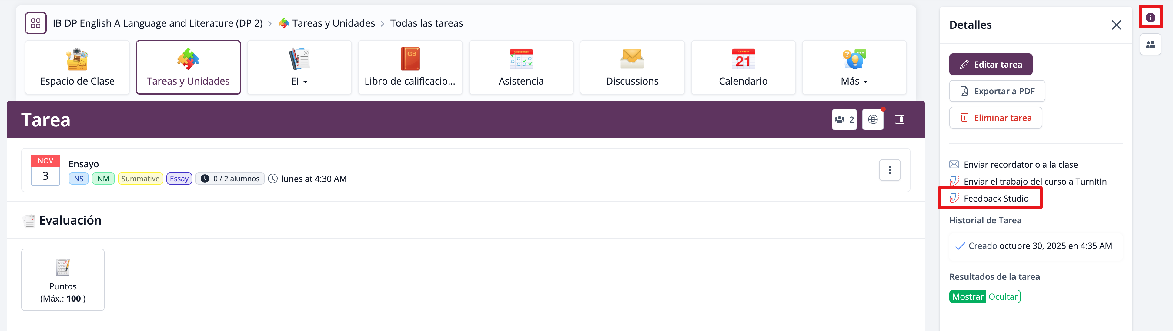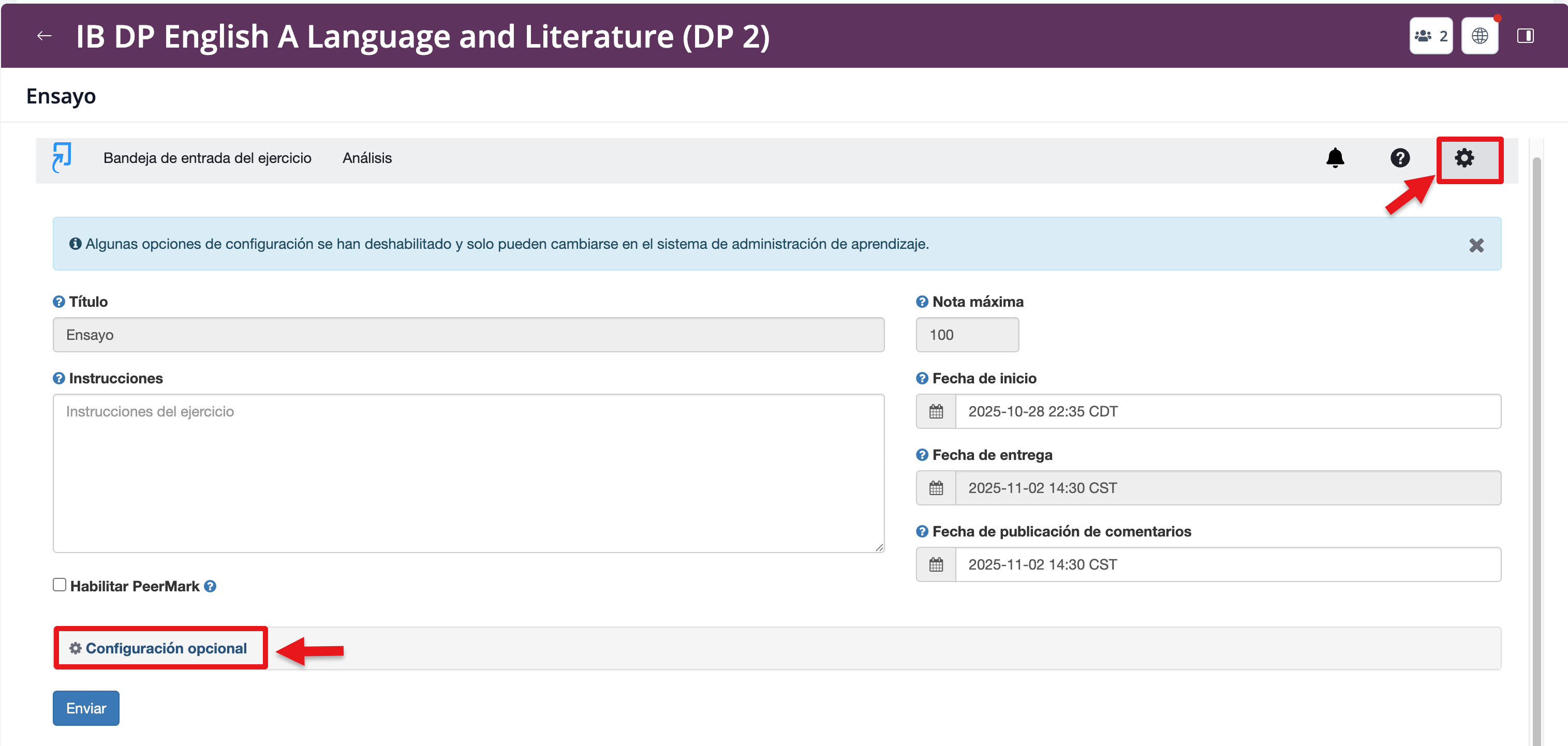 En el Feedback Studio Assignment Inbox, haz clic en Ajustes > Configuración opcional para acceder a la configuración de la tarea en Turnitin, explicada en detalle en este enlace.