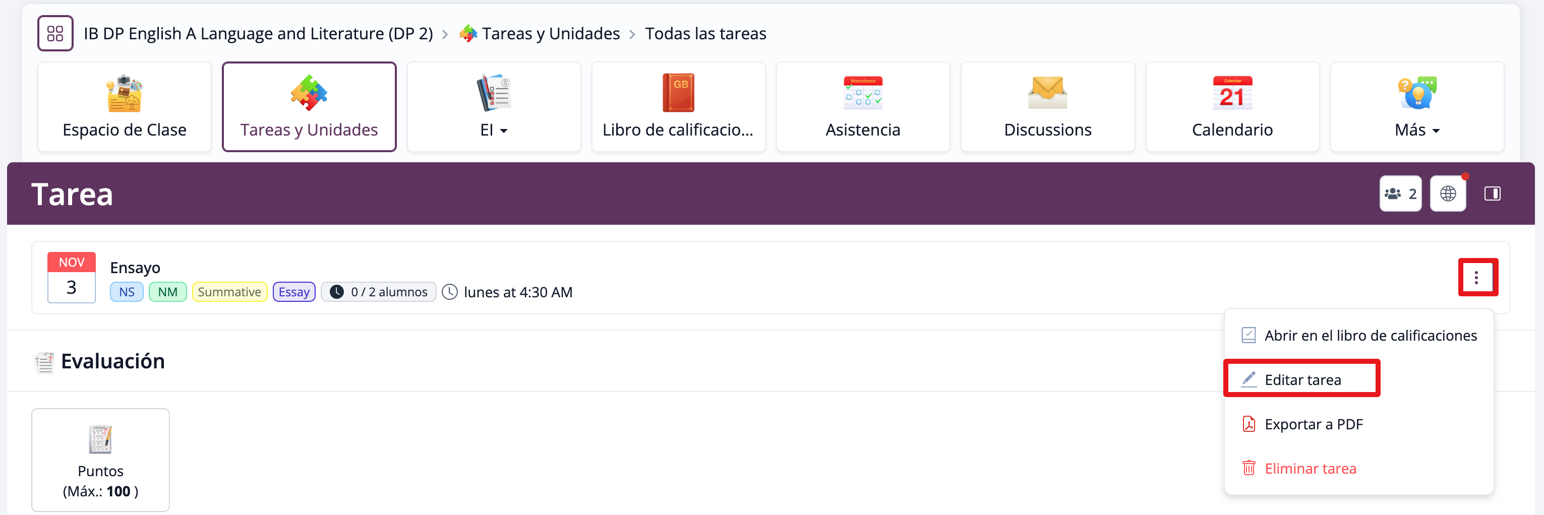 Si es necesario, puedes editar la fecha de entrega de la tarea o fecha límite en ManageBac+ y habilitar Turnitin al mismo tiempo.