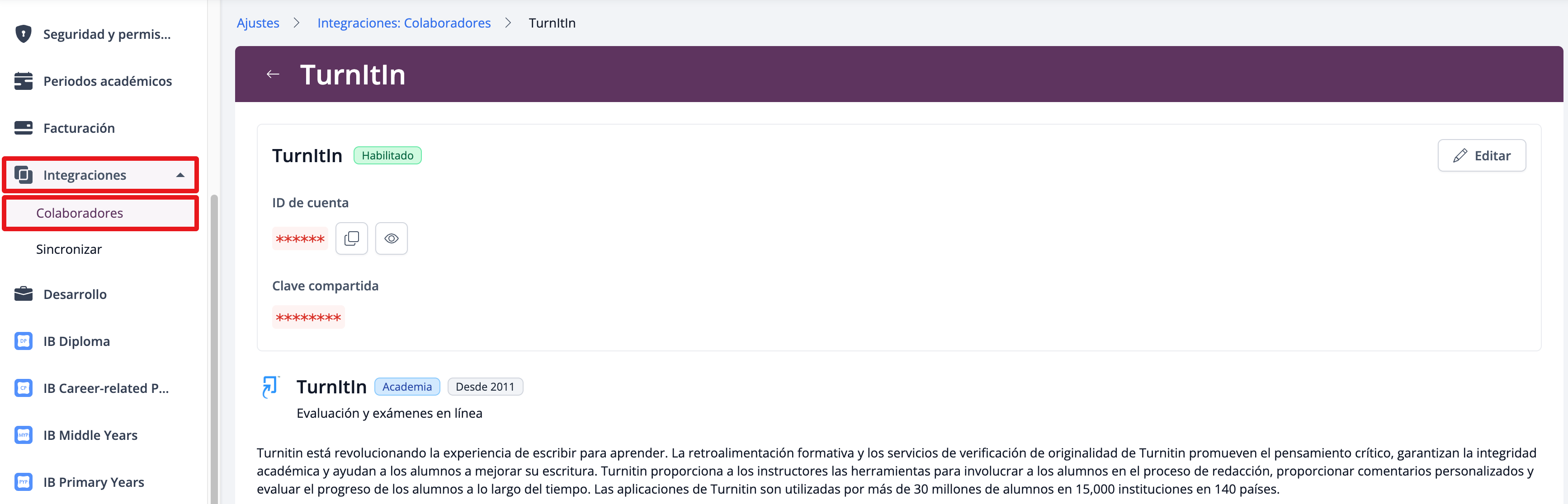 Las credenciales de integración pueden revisarse y editarse desde Ajustes del colegio > Integraciones > Colaboradores > Turnitin.