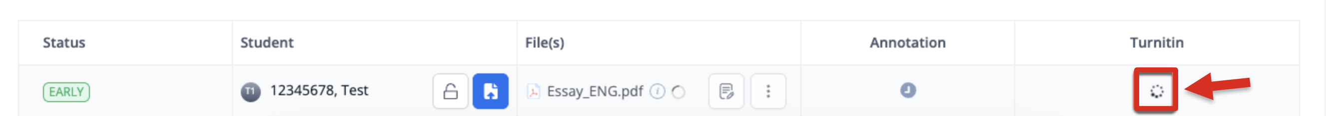 El ícono de rueda giratoria suele indicar que los datos de la tarea de Turnitin no llegaron correctamente a los servidores de Turnitin. Es posible que debas hacer clic en el botón Submit Coursework to Turnitin en el panel de navegación derecho de la tarea en ManageBac+ para volver a enviar los datos a Turnitin y generar los índices de similitud de los archivos enviados.