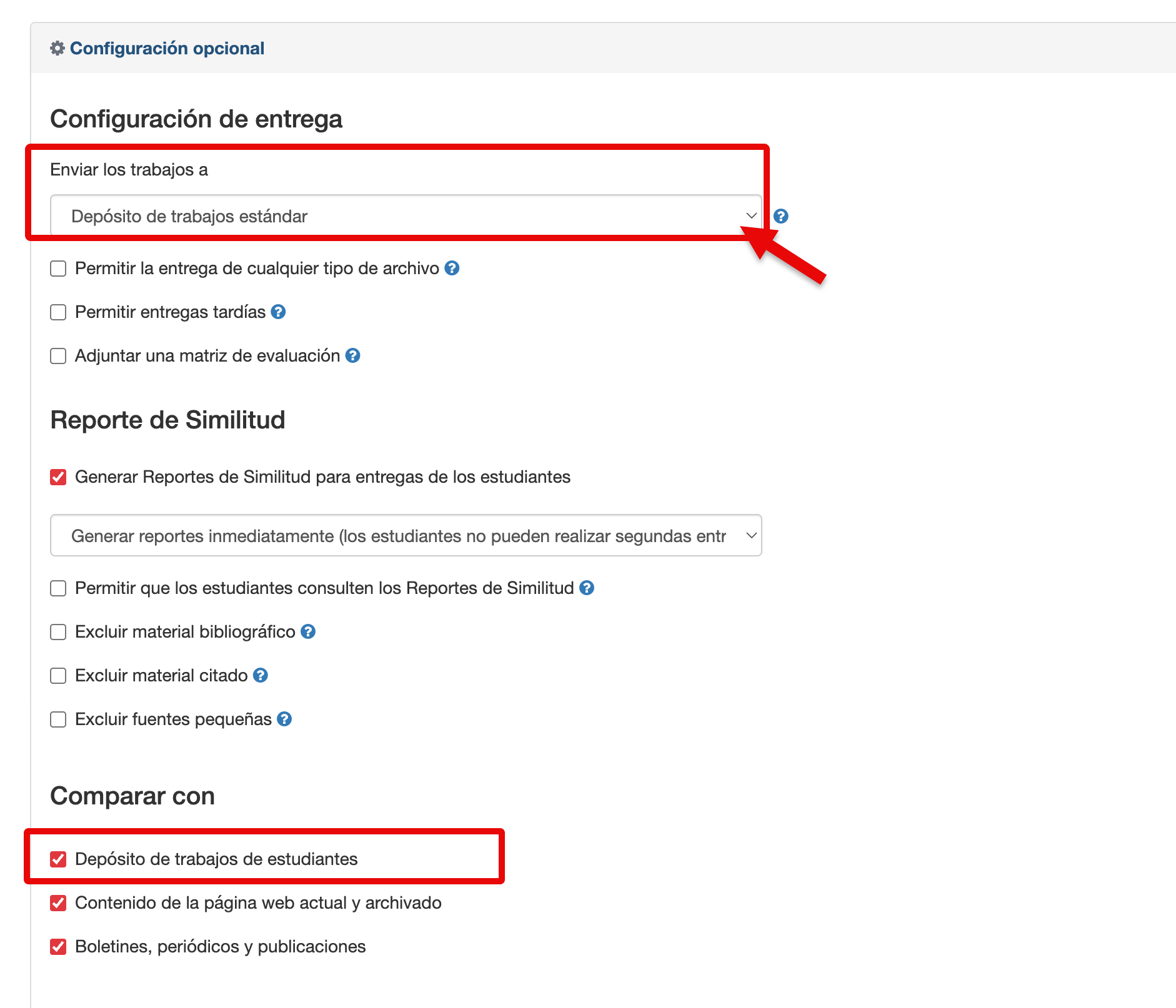No comparar contra el repositorio de documentos: puedes optar por no comparar la entrega final (o ninguna entrega) con el repositorio de trabajos de los estudiantes. Así se evitará un índice de similitud elevado.