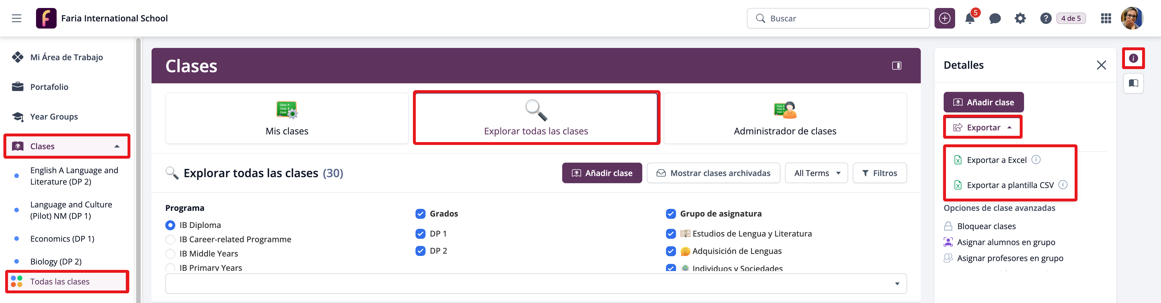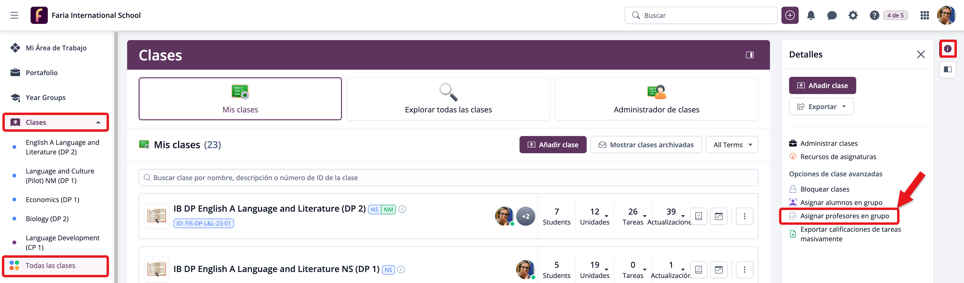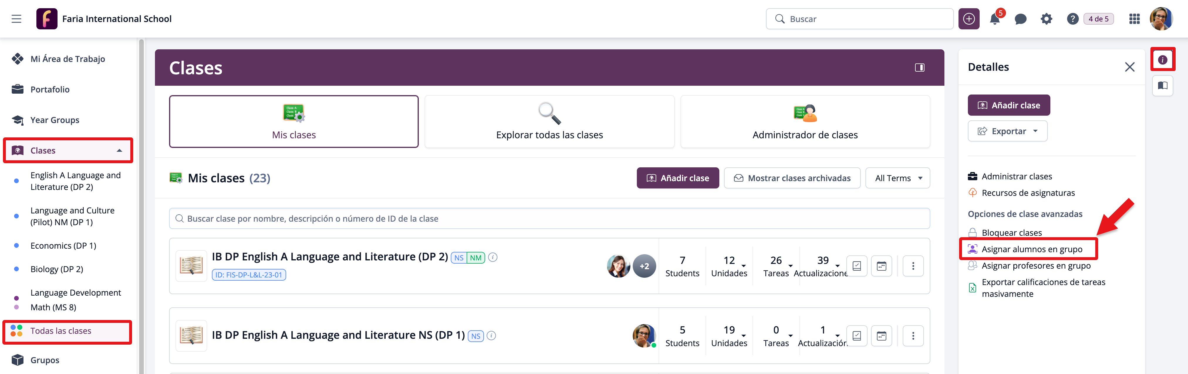 Los administradores de ManageBac+ pueden asignar estudiantes a las clases en bloque desde la pestaña Todas las Clases. En el panel de navegación derecho, haz clic en Asignar alumnos en grupo.