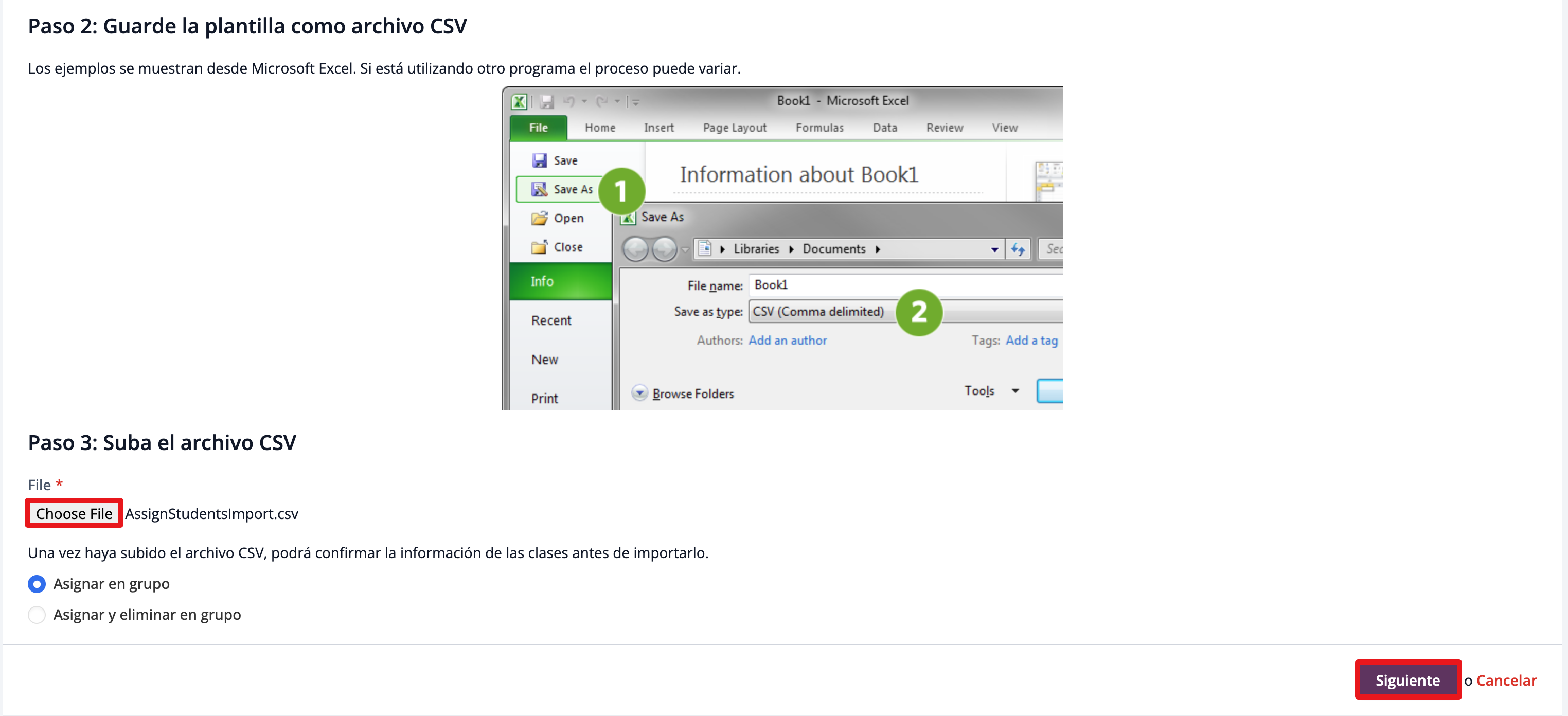 Después de guardar el archivo CSV, puedes subir el documento en la parte inferior de la página. Selecciona Choose File para cargarlo.