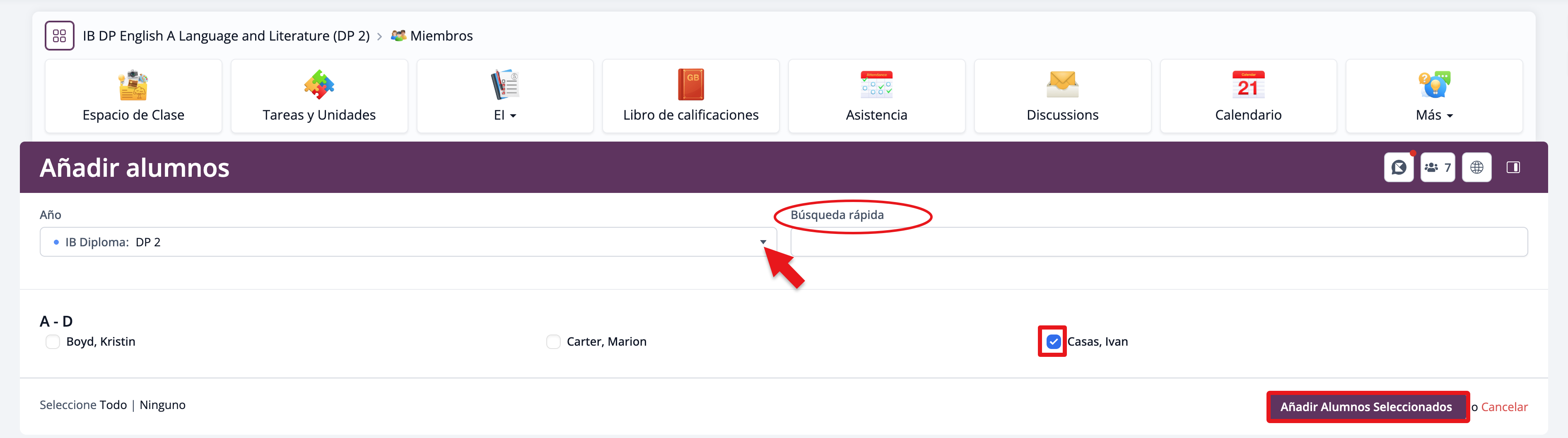 Puedes agregar estudiantes marcando sus nombres en la lista y haciendo clic en Añadir Alumnos Seleccionados al final de la página.