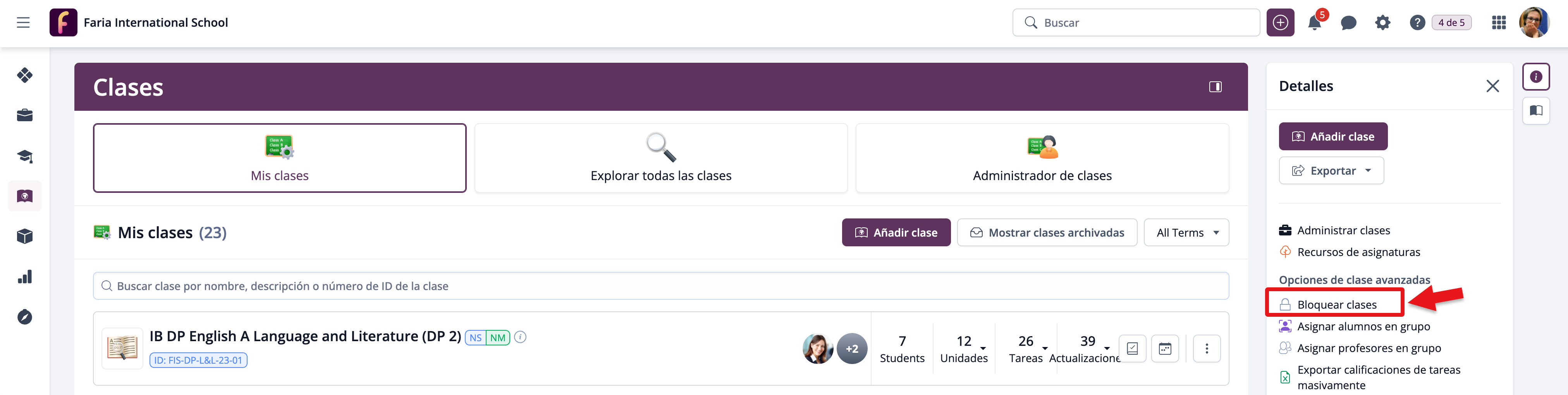 Si no deseas que los estudiantes se unan o salgan de las clases, se recomienda Bloquear clases desde Clases > Todas las Clases > Bloquear clases (panel derecho).