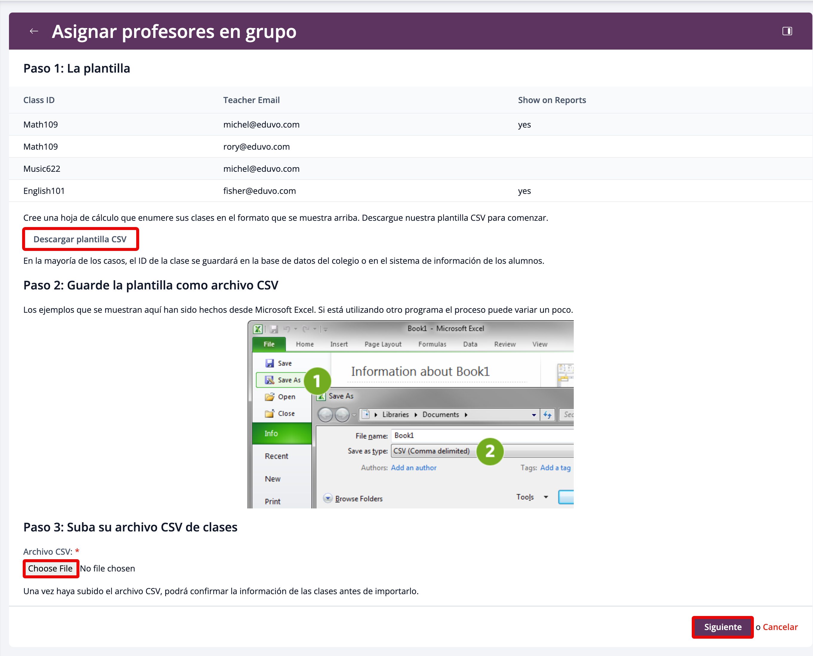 Puedes asignar más de un profesor a una clase agregando cada profesor y su ID de clase en una nueva fila. Configura cuál profesor se mostrará en los informes.