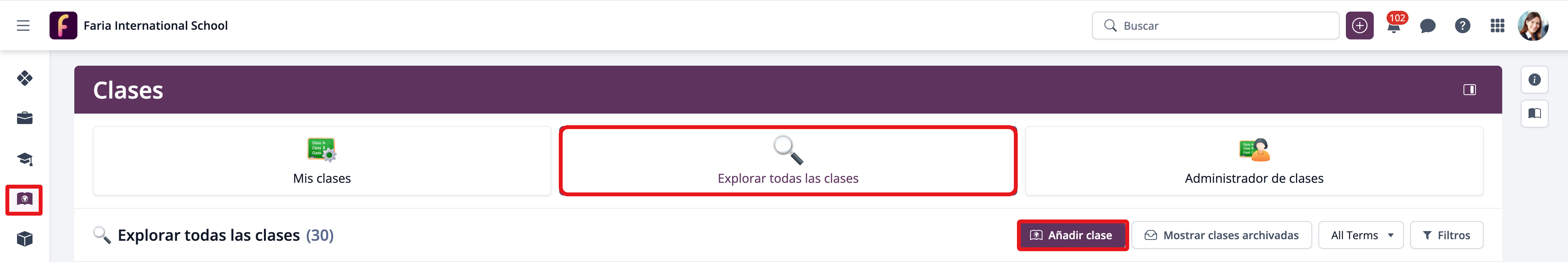 Los profesores con permisos de clase podrán crear sus propias clases desde Clases > Todas las Clases > Añadir clase. Esta configuración puede aplicarse a todos los profesores o de forma individual desde Permisos de Usuario.