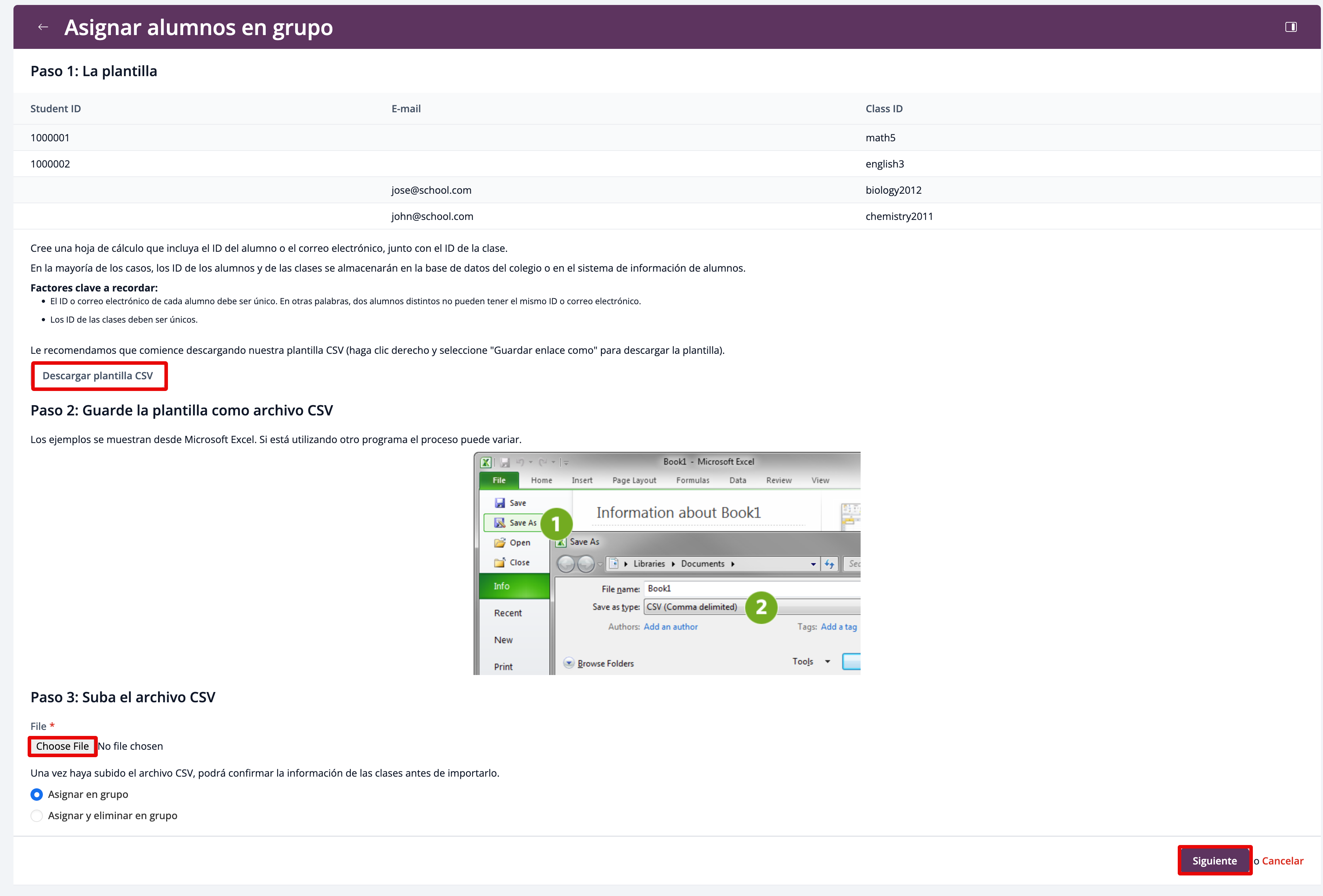 Esta opción asignará a los estudiantes a las clases que aparecen en la lista, reemplazando todas las asignaciones cargadas previamente.