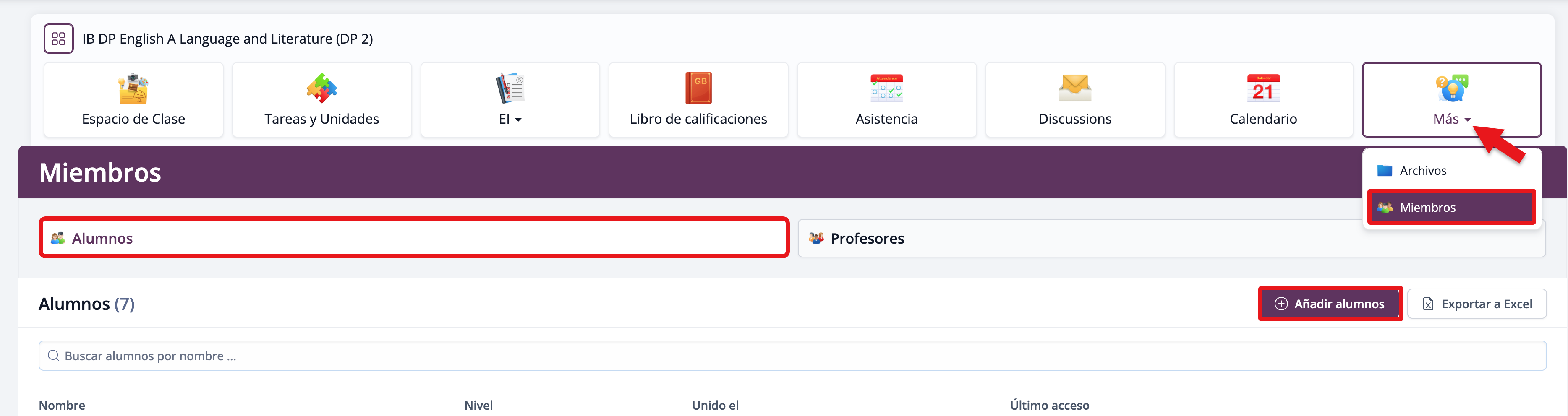 Después de crear las clases, los profesores o administradores pueden agregar estudiantes a cada clase haciendo clic en Añadir alumnos en la pestaña Miembros > Alumnos.
