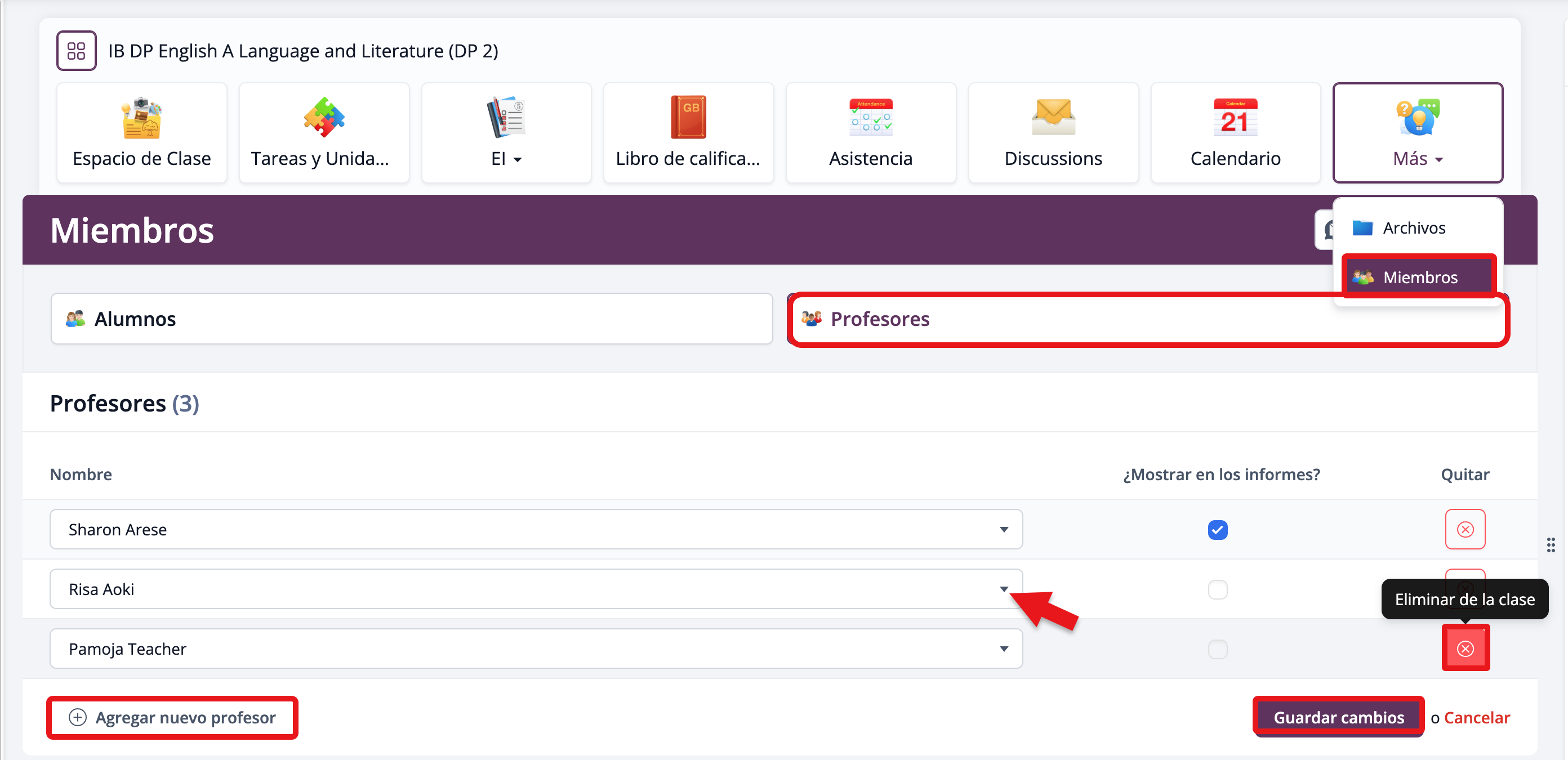 Para eliminar profesores, utiliza la casilla X (Eliminar de la clase). Haz clic en Guardar cambios para finalizar la asignación.