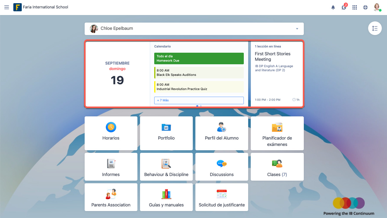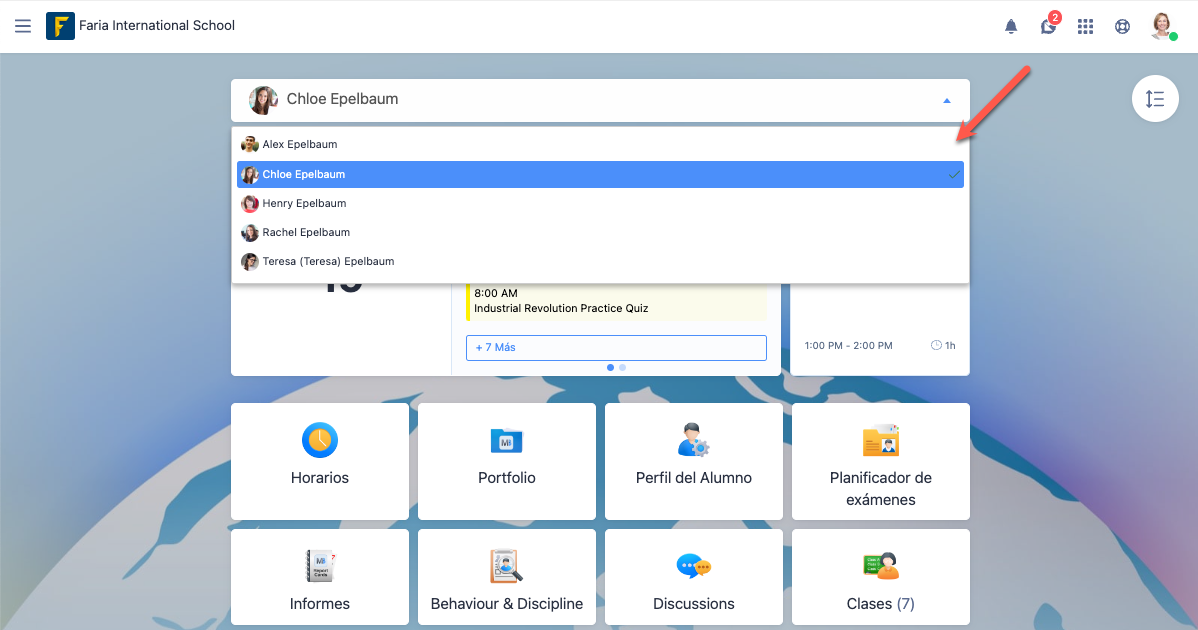 Si tiene más de un hijo registrado en ManageBac+, podrá alternar entre ellos a través del menú desplegable.