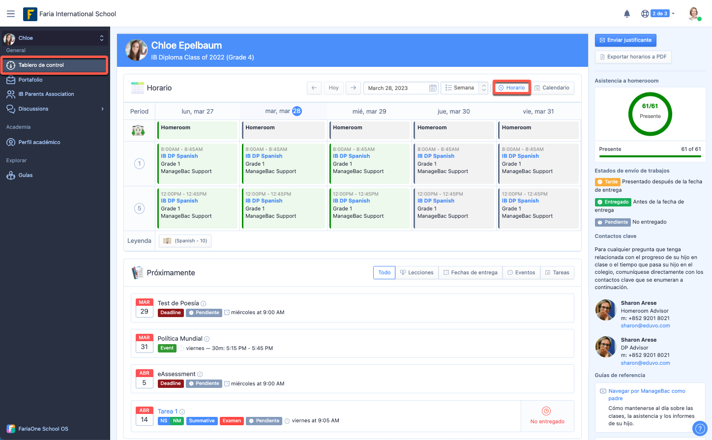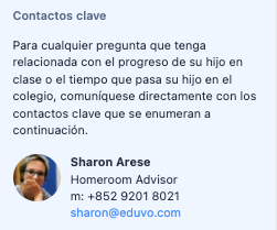 Debajo de Asistencia a Homeroom, también puede encontrar los datos de contacto del Asesor de clase de su hijo.