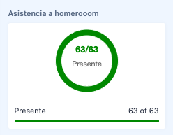 En la parte derecha, verá un gráfico de asistencia de la clase, indicando los registros de Presente, Retraso o Ausencia para el período académico actual en forma de gráfico y recuento numérico.