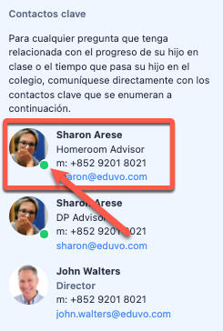 Cuando los usuarios inician sesión en ManageBac+, un indicador de presencia en línea se mostrará junto a su foto como un punto verde. Este indicador aparecerá junto a la miniatura de cualquier usuario que esté conectado en ese momento, incluidos padres, alumnos y sus profesores y asesores.