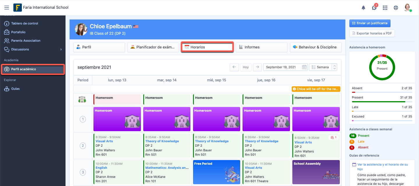 En la sección Perfil académico, puede seleccionar la pestaña de Horarios. Aquí puede consultar la Asistencia de su hijo desde su Horario diario.