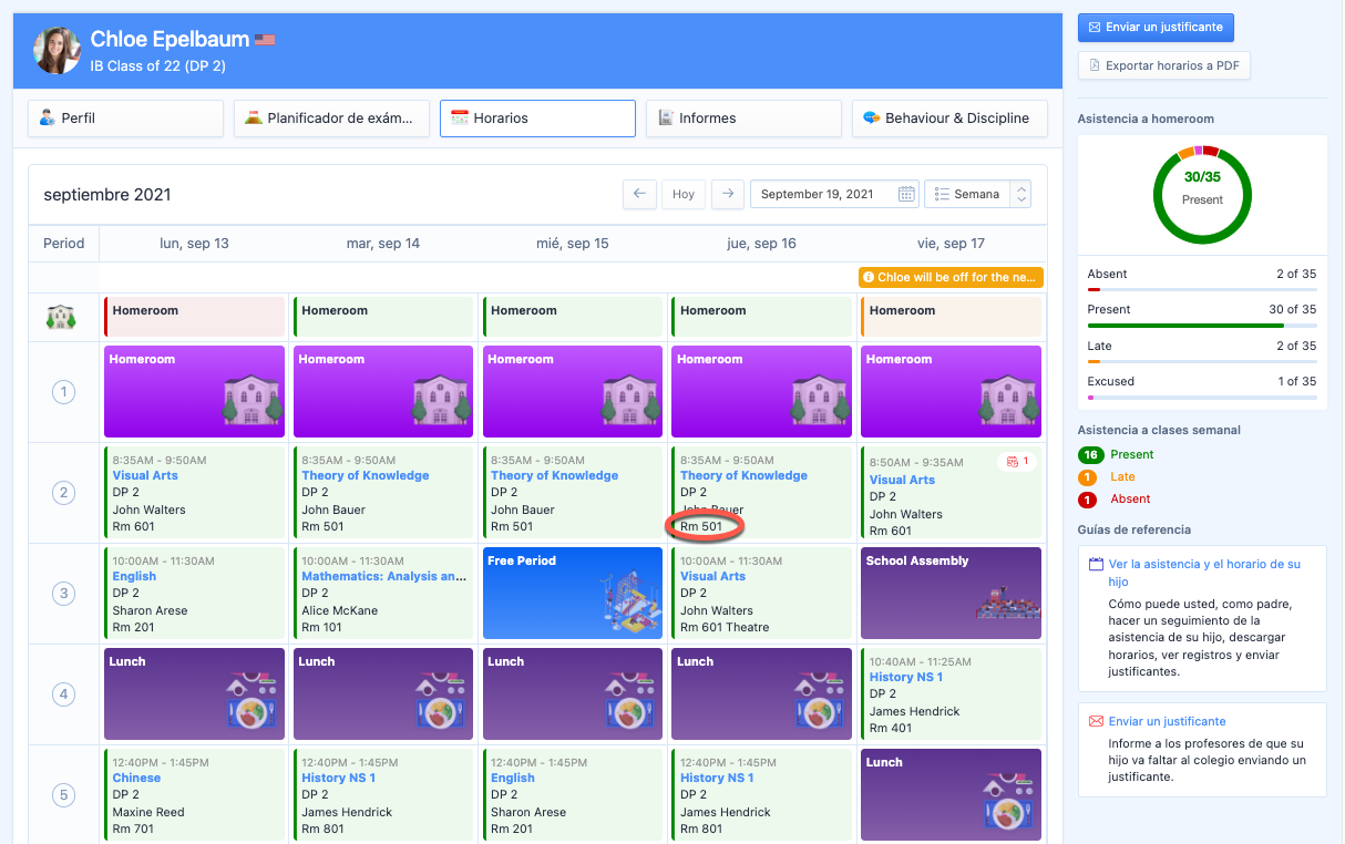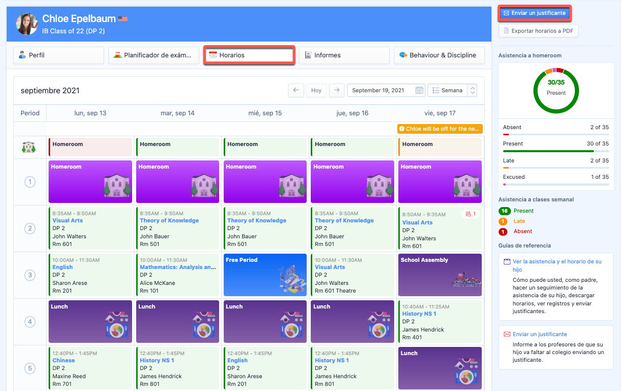 En el centro de la página, puede ver los horarios de su hijo con los datos de asistencia de la semana en curso y cualquier registro de ausencia a Homeroom. Pulse en el título de la clase para ver más detalles sobre cada clase y periodo.