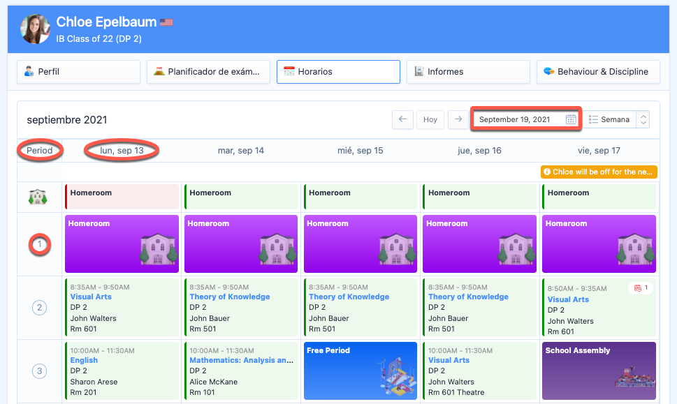 Vea el número del periodo de una clase en la parte izquierda de la página y la fecha en la parte superior. Seleccione la fecha en el buscador de fechas del Calendario o navegue hasta una semana o un día concretos.