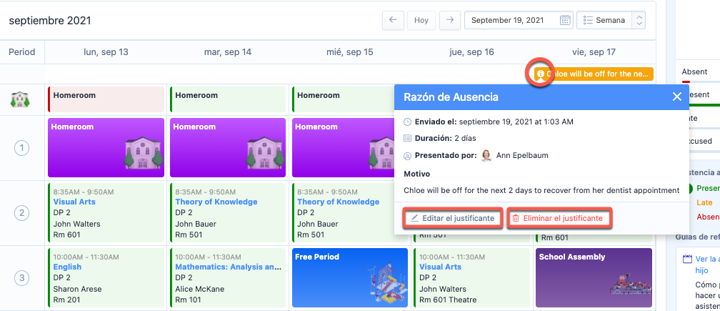 Para editar el justificante una vez enviado, pase el ratón sobre el icono "i" de la etiqueta de la Razón de Ausencia de asistencia para ver los detalles completos de este justificante. Pulse en Editar el justificante para realizar cambios en la duración o la descripción de la misma, o en Eliminar el justificante.