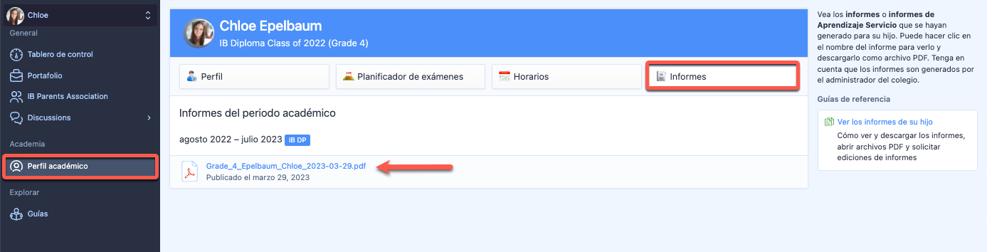 A través de Perfil académico > Informes