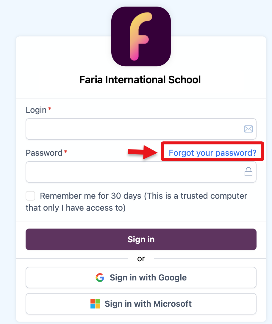 Si no recuerdas tu contraseña, desde la página de inicio de sesión de ManageBac+ de tu colegio haz clic en Forgot your password?