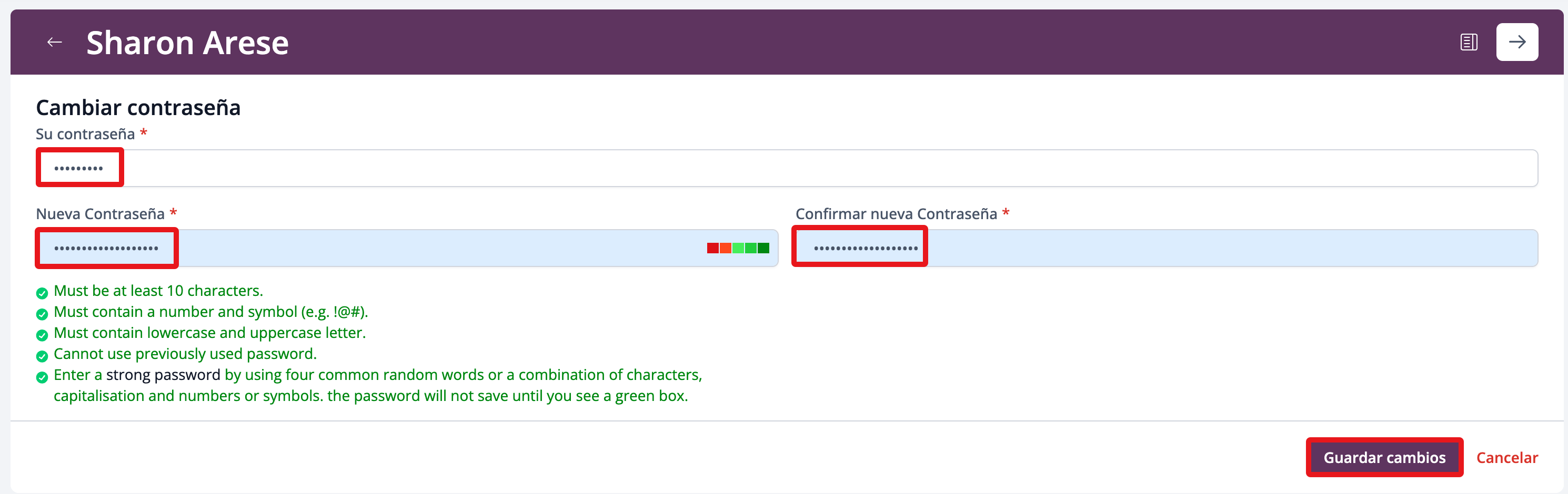La nueva contraseña no se guardará hasta que veas un recuadro verde oscuro confirmando el cambio.